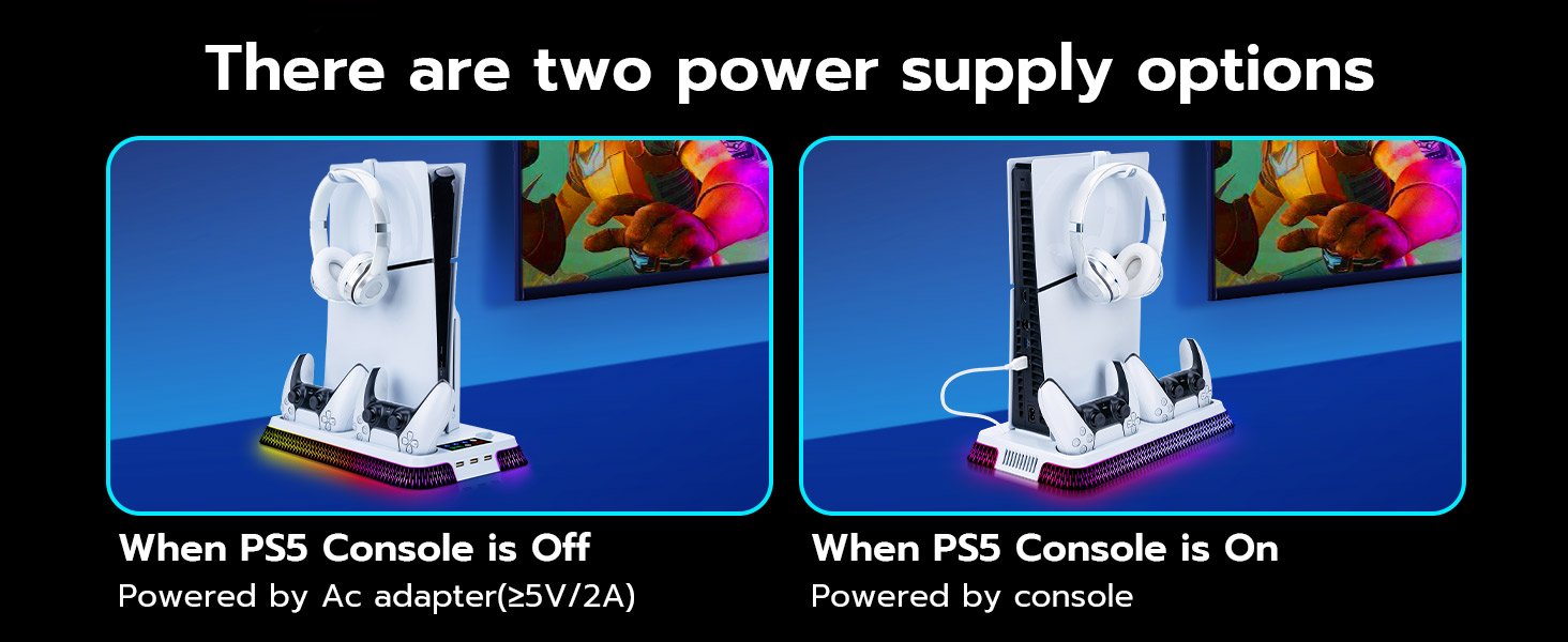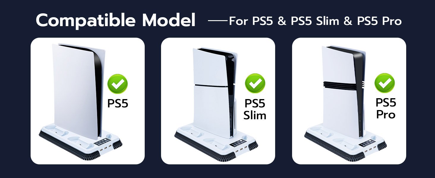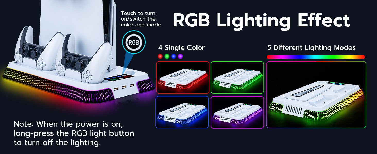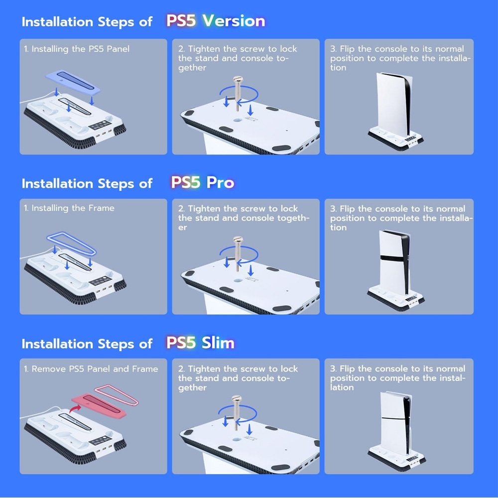 - Wide Compatibility: RGB Cooling Stand Compatible with PS5 Standard/Digital Edition (2020) 、PS5 Slim Standard/Digital Edition (2023) and PS5 PRO .Includes Security Screws & Anti-Skid Pads