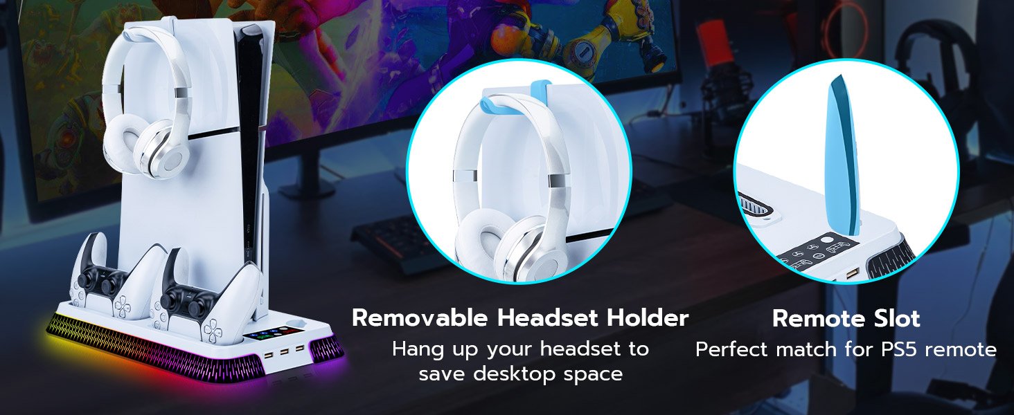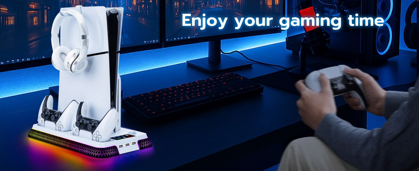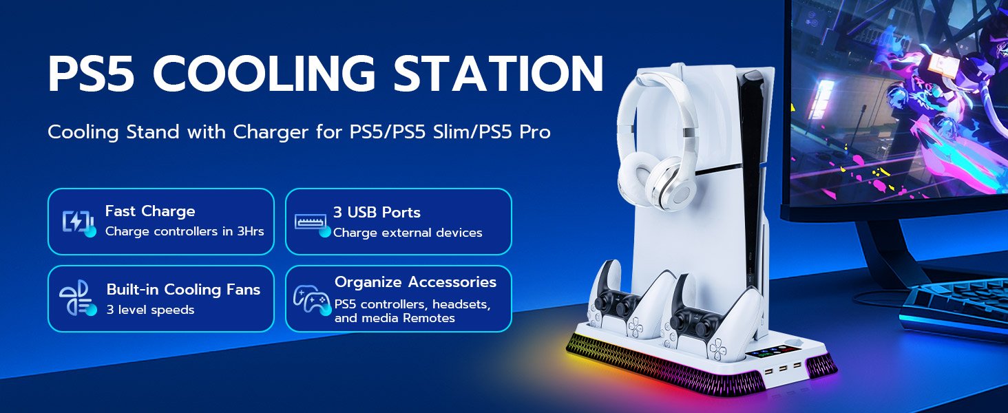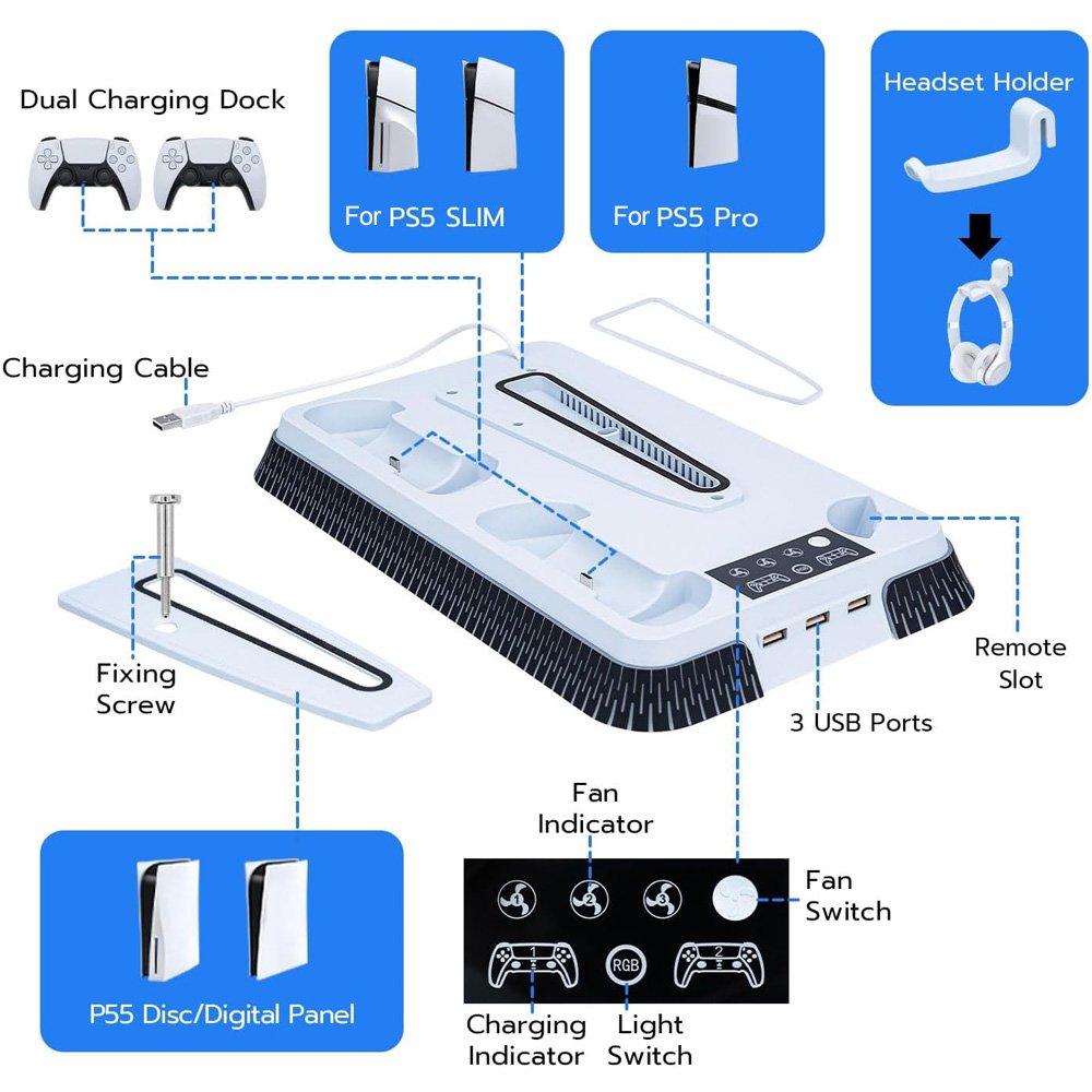- Wide Compatibility: RGB Cooling Stand Compatible with PS5 Standard/Digital Edition (2020) 、PS5 Slim Standard/Digital Edition (2023) and PS5 PRO .Includes Security Screws & Anti-Skid Pads