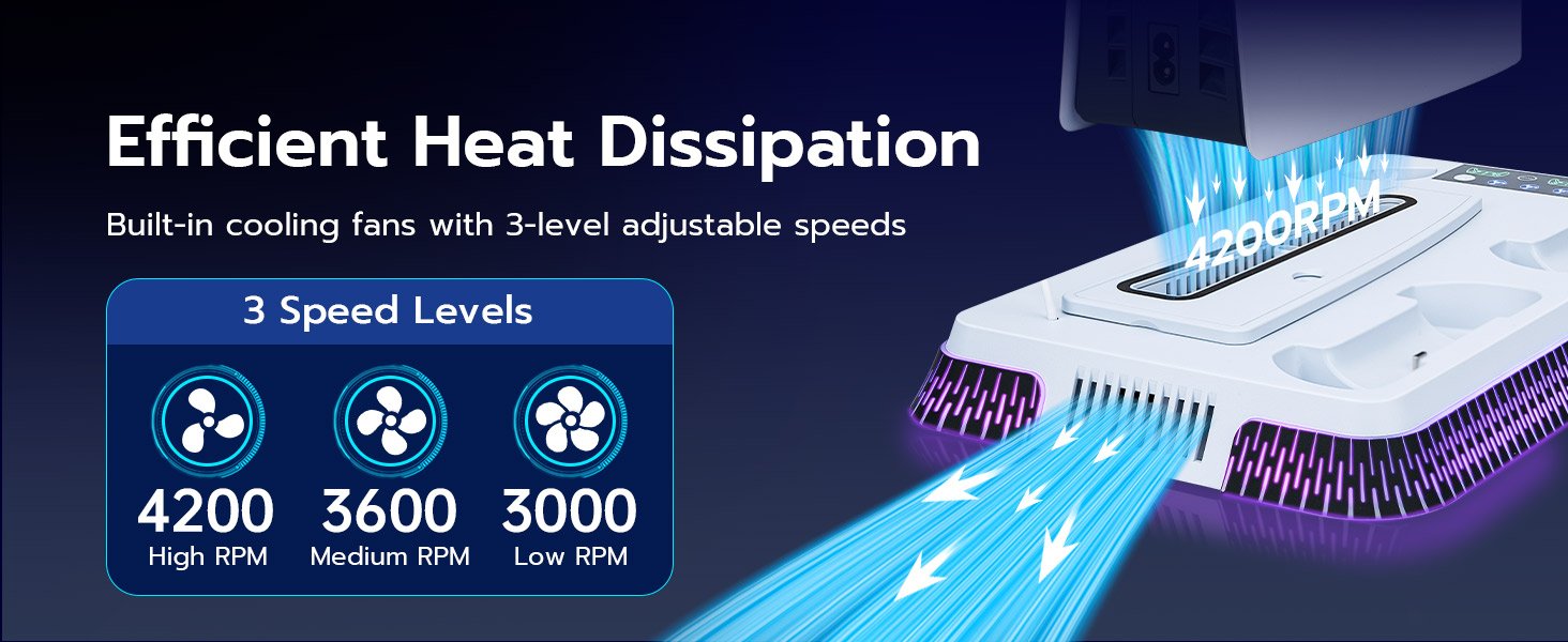 - 3-Speed Adjustable Cooling Fan: The stand features a 3-level adjustable cooling fan with speeds of 3000 RPM (low), 3600 RPM (medium), and 4200 RPM (high). The fan works efficiently to reduce your console’s temperature, preventing overheating and ensuring long-lasting stability during long gaming sessions.