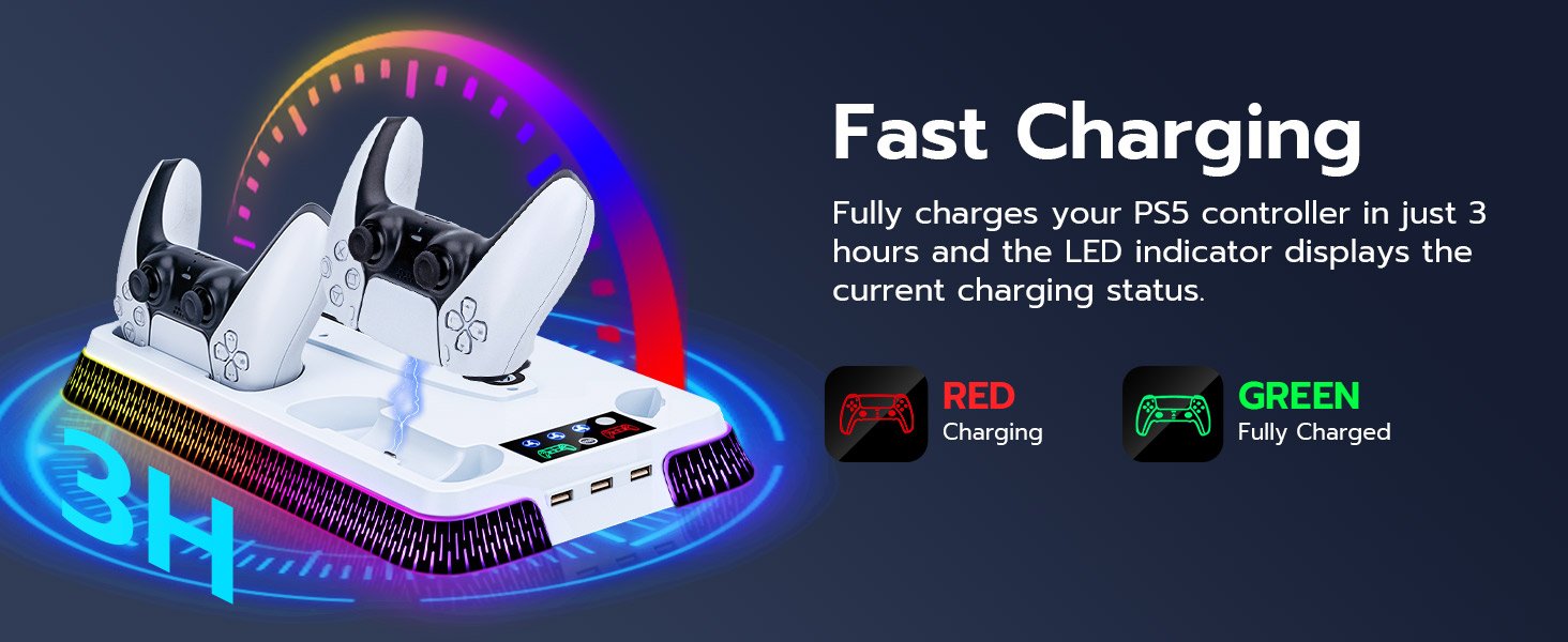 Charging Function: Two dedicated slots for simultaneous charging of PS5 DualSense controllers, featuring clear LED charge status indicators.
