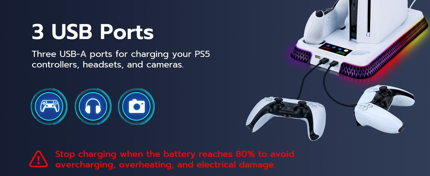 - 3 USB Ports & Overcharge Protection: The cooling stand includes three USB female ports. The smart protection chip prevents overcharging by cutting off charging at 80% capacity, avoiding overheating, electrical damage, and ensuring device safety.
